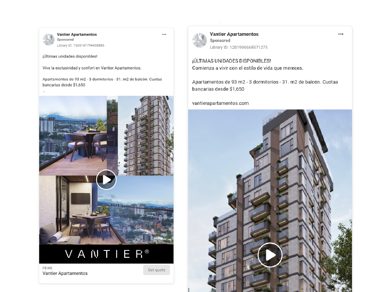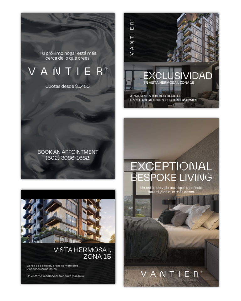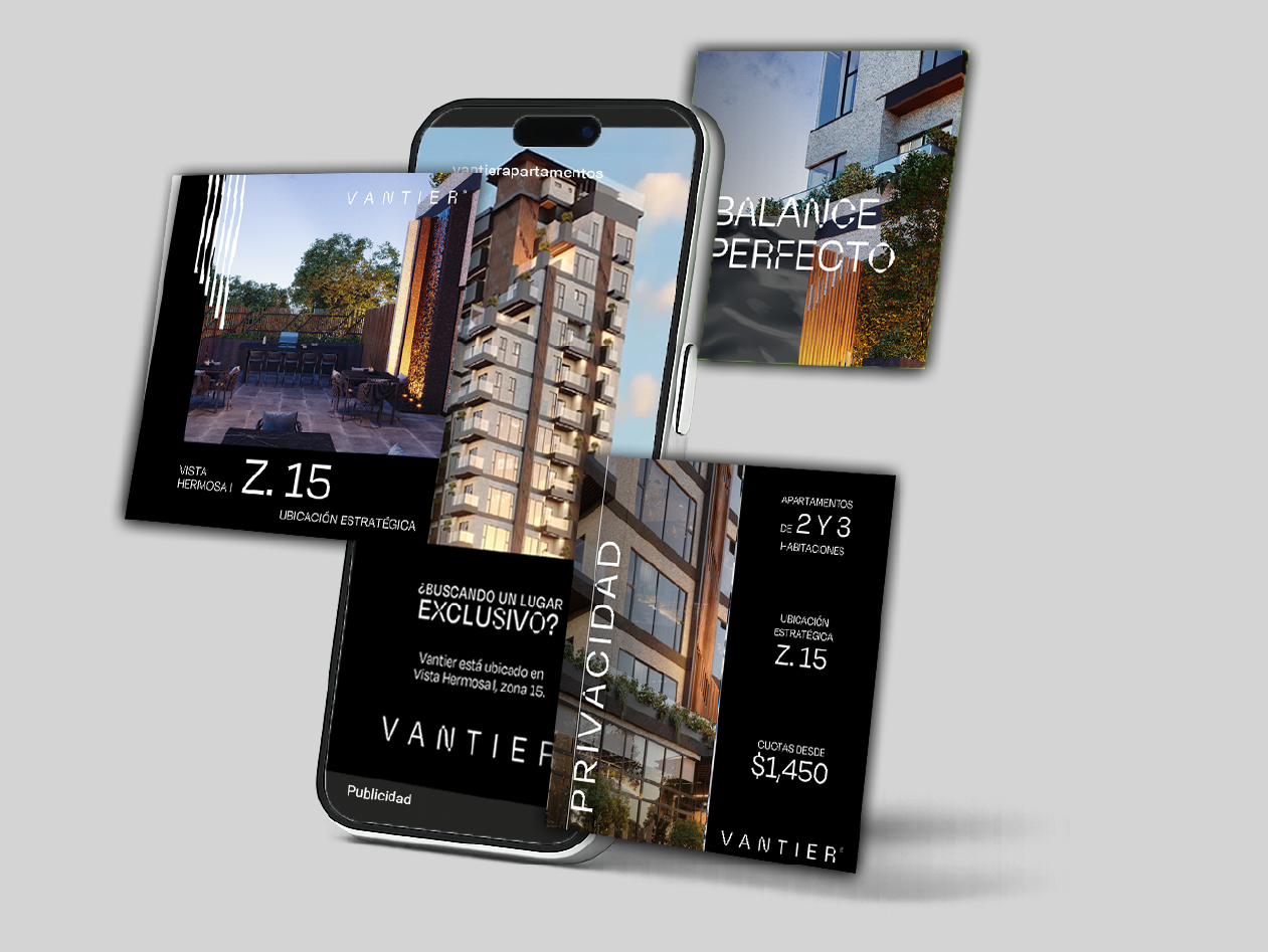 El resultado: Proyecto vendido en su totalidad por medio de captación de clientes potenciales a través de estrategia paid media en un 100%. Vantier logró posicionarse rápidamente como uno de los desarrollos mejor colocados de su categoría en zona 15.